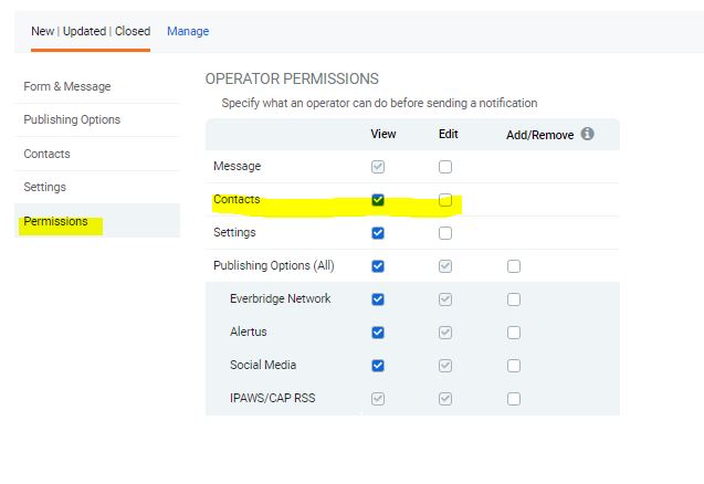 - Ensure that the Edit check box is selected for Contacts within the Operator Permissions: