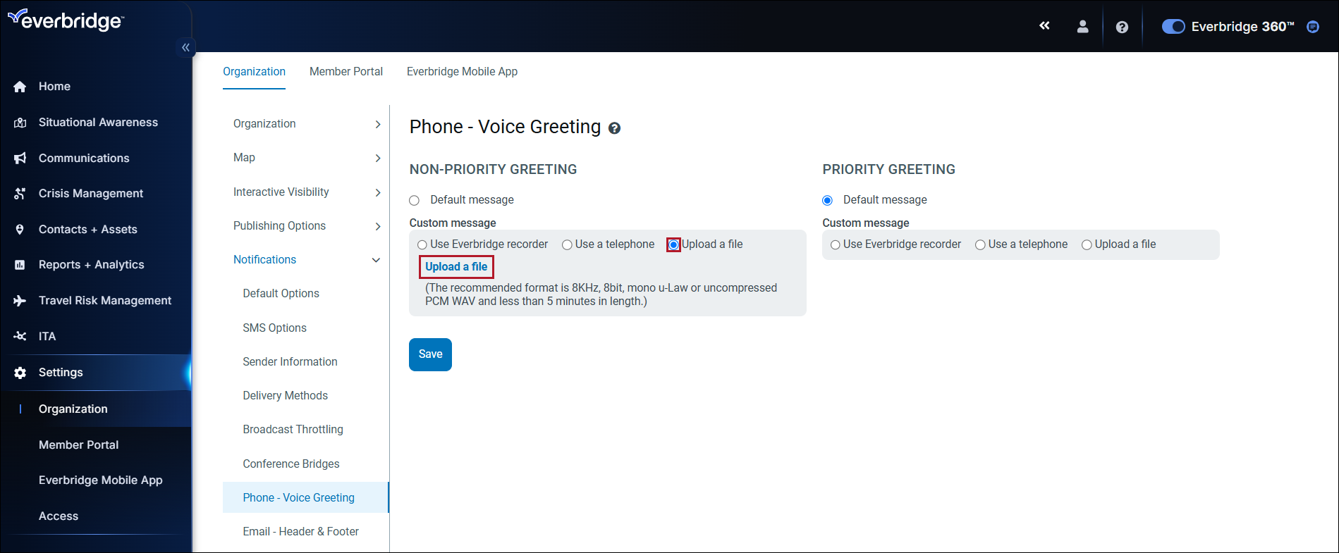 How to record a custom voice greeting to be used as a default voice greeting for all Notifications from Everbridge Suite.