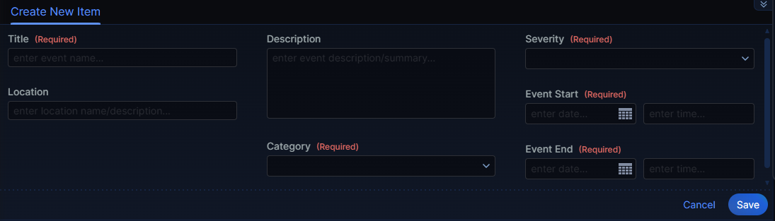 Risk Events in CEM are normally entered by the Everbridge Risk Intelligence Monitoring Center (RIMC), Authoritative Sources (National Weather Service, USGS, GDACS), or through Custom Self-Service Feeds. An Operator-Entered Risk Event is a Risk Event entered by the VCC Operator directly into the Visual Command Center Operator Console.