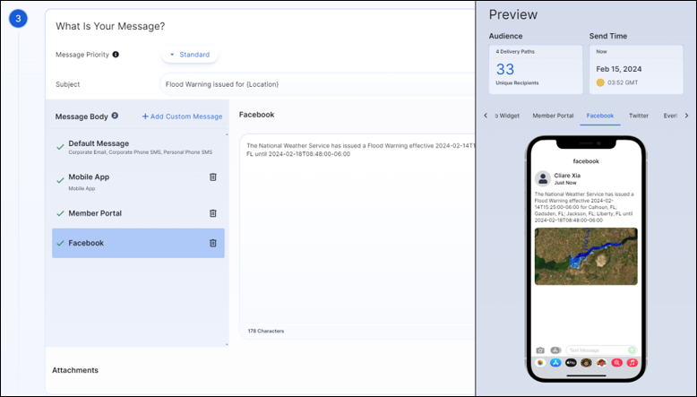 | Everbridge 360 | Communications | Message | The Message Body and Custom Message sections have been reorganized to improve usability. | Optimized user interactions and a streamlined interface allow users to launch Communications more efficiently. |
