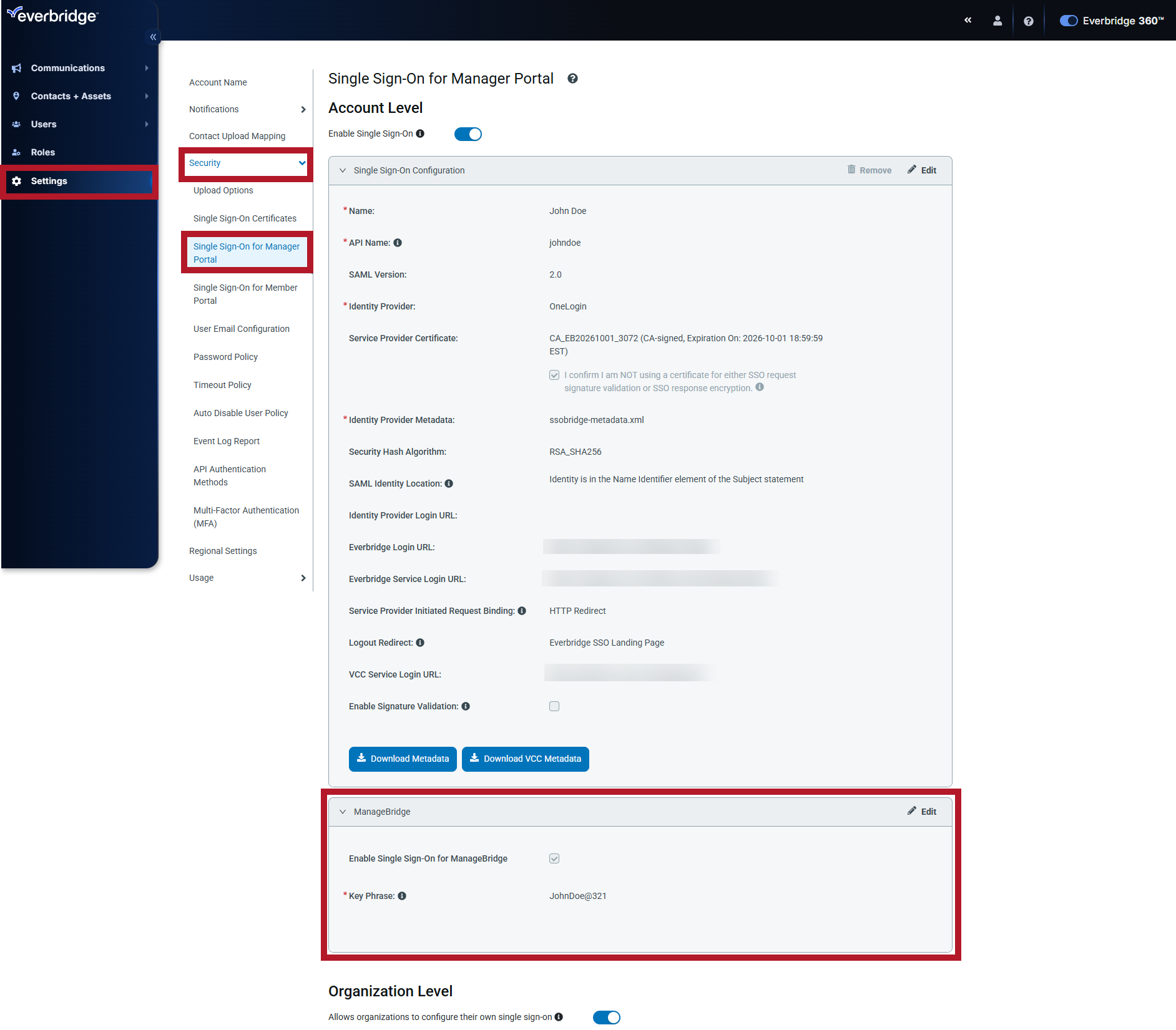 - Select Settings > Security > Single Sign-On for Manager Portal