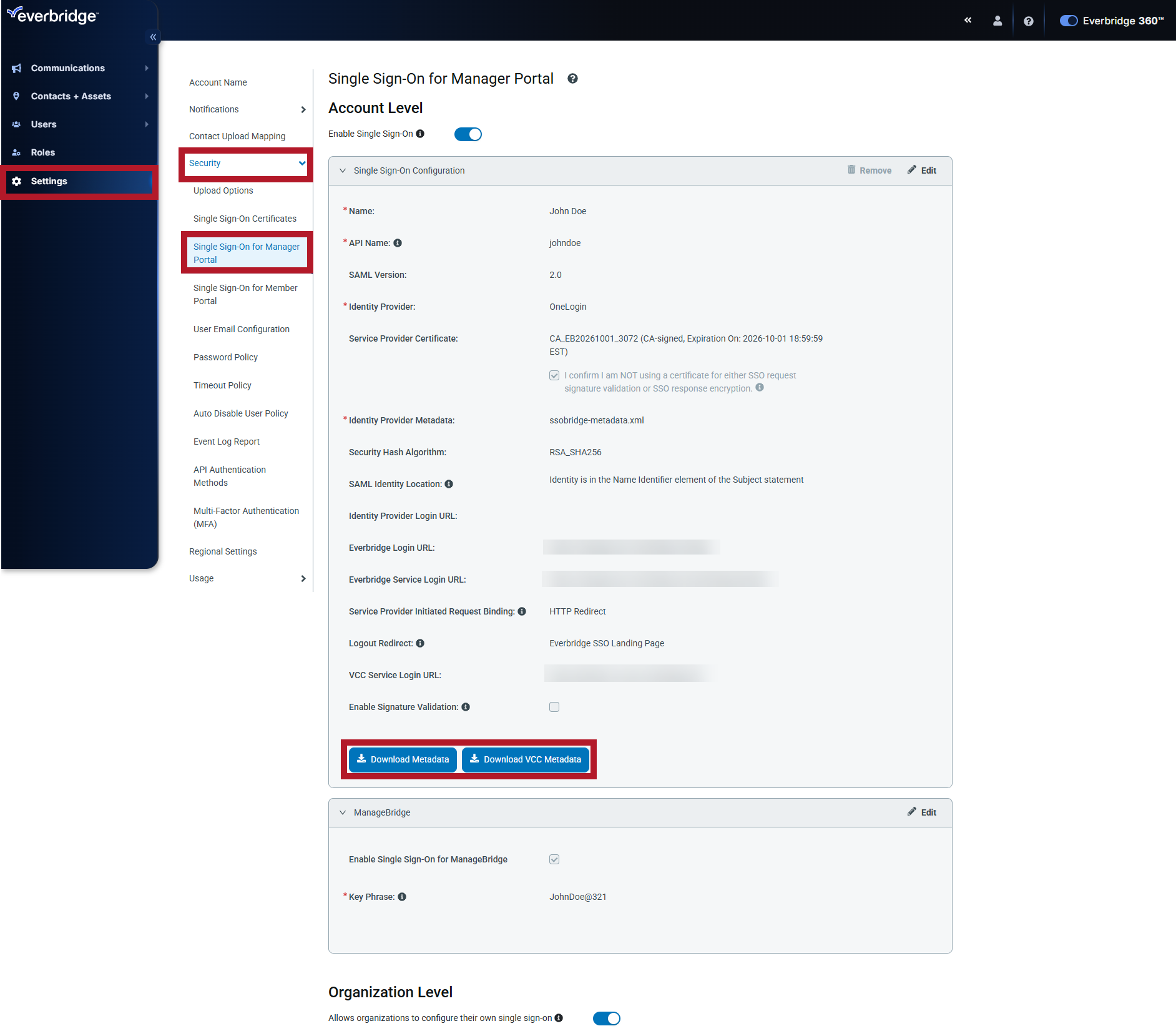Once you have configured Single Sign-On (SSO) for the Everbridge Manager Portal, you can download the metadata XML file for safe keeping.