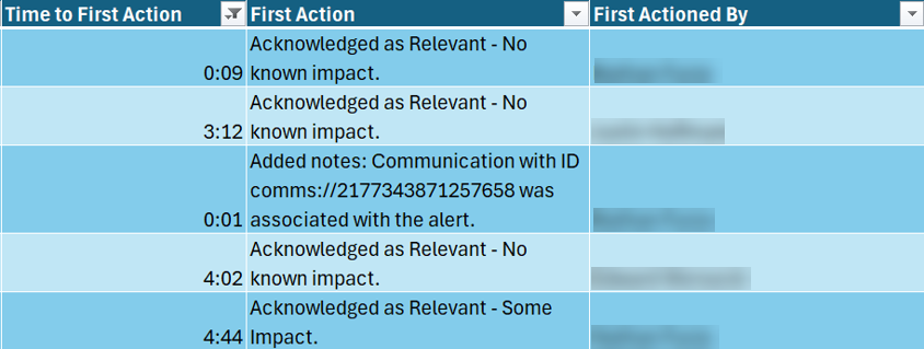 The All-Alert Report run from Visual Command Center Operator console will calculate the time from Alert Creation to the first Operator action (non-system user). The Alert Report will include the following fields: