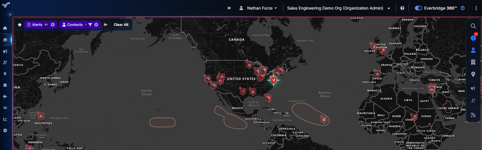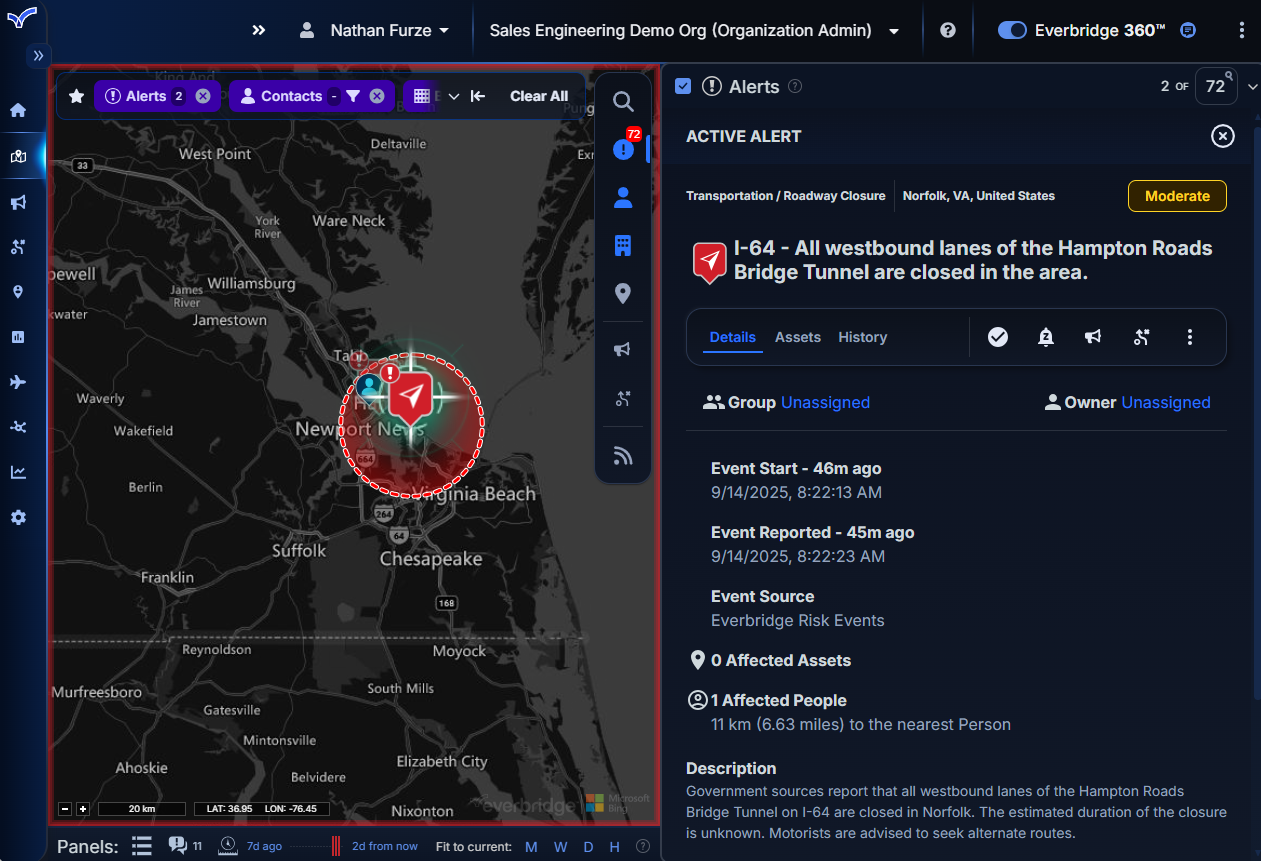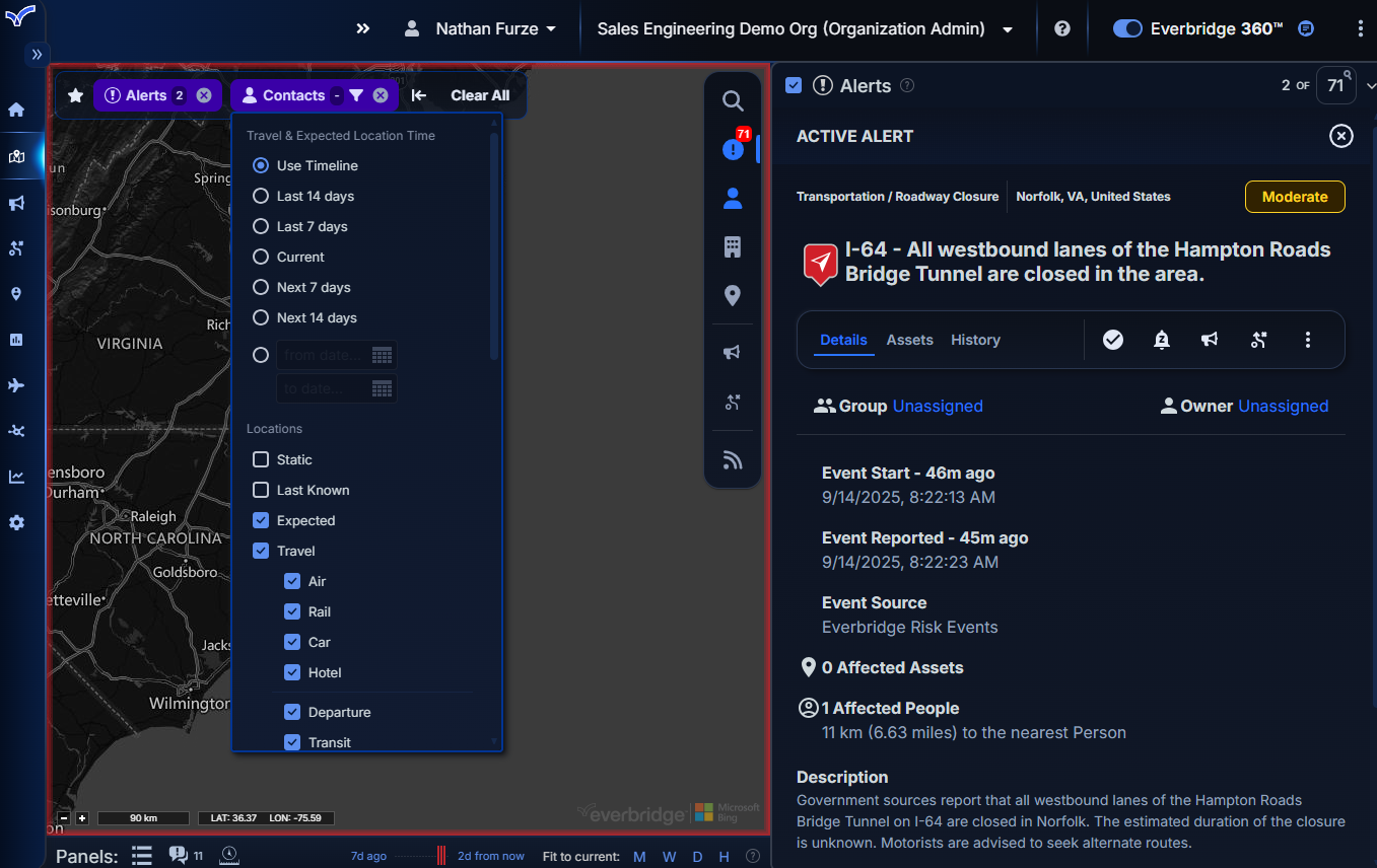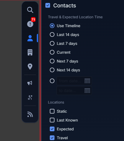- The right-side feed panel has been enhanced to give each element (alerts, contacts, assets, etc.) full vertical space for viewing data and applying filters. To maximize map visibility, the panel can also be minimized into an icon-based menu.